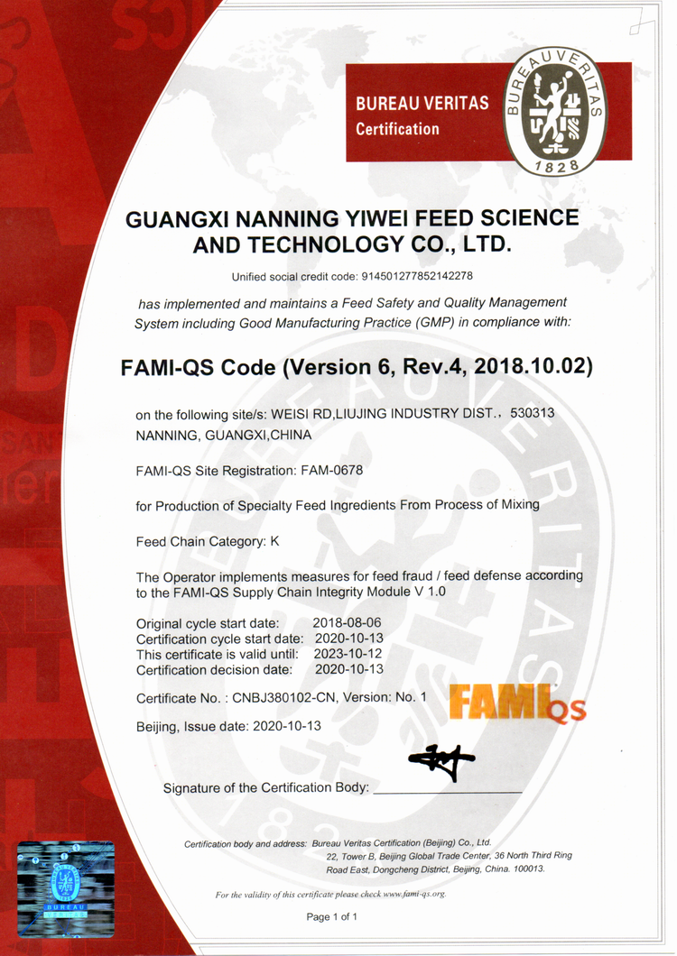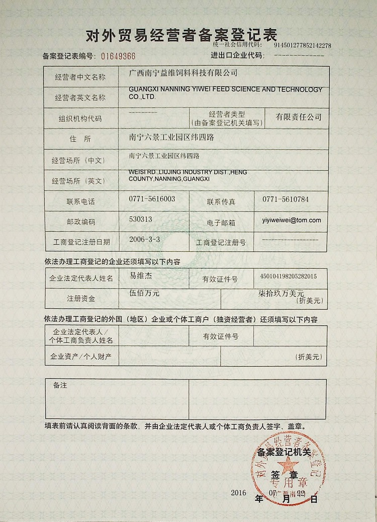 益維—出口飼料生產(chǎn)加工存放企業(yè)檢驗檢疫注冊登記證